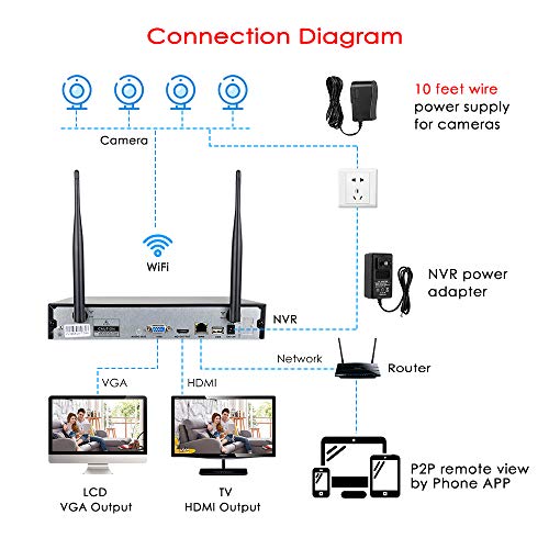 - 【EXPANDABLE 8 CHANNEL CAMERAS】 Extensible 8 channel cameras(Asin:B07FVSK6BY),refer video:https://youtu.be/DcjnmvL3VJs.This system includes 1x 8-channel 1080P (1920x1080) NVR and 4 x 960P (1280 X 960) wireless IP66 waterproof Camera.cameras and nvr are Paired before shipping,Connect the NVR and Cameras with Power Adapter,Cameras configuration 10 ft cable Power Supply ,be fit for Installation.